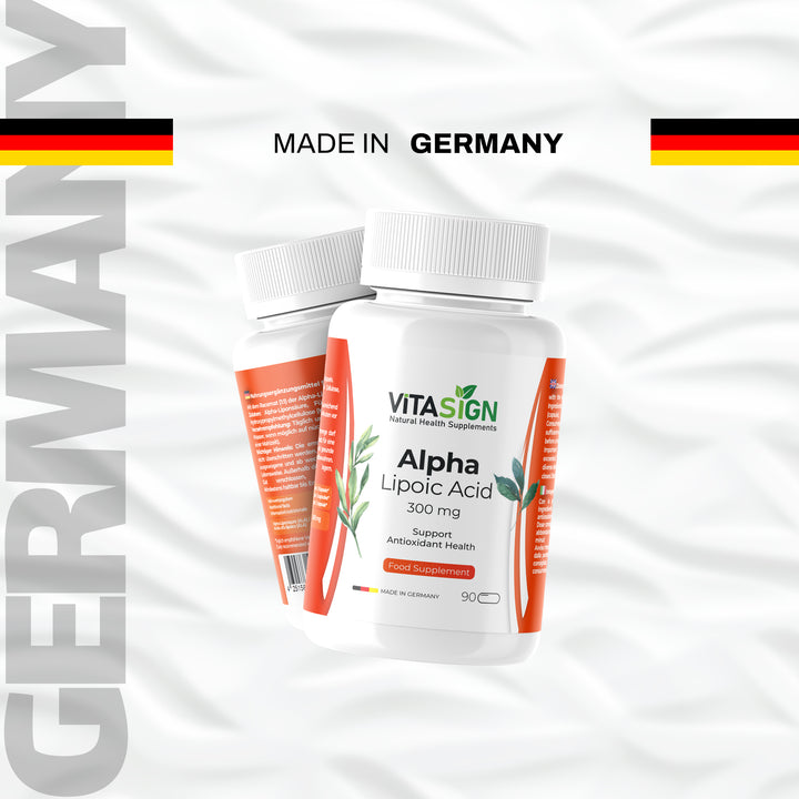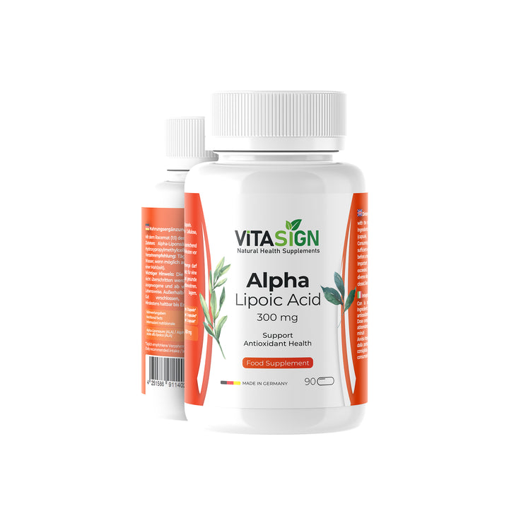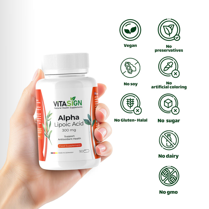 VITASIGN Alpha Lipoic Acid contains 300mg of alpha-lipoic acid per vegan capsule.