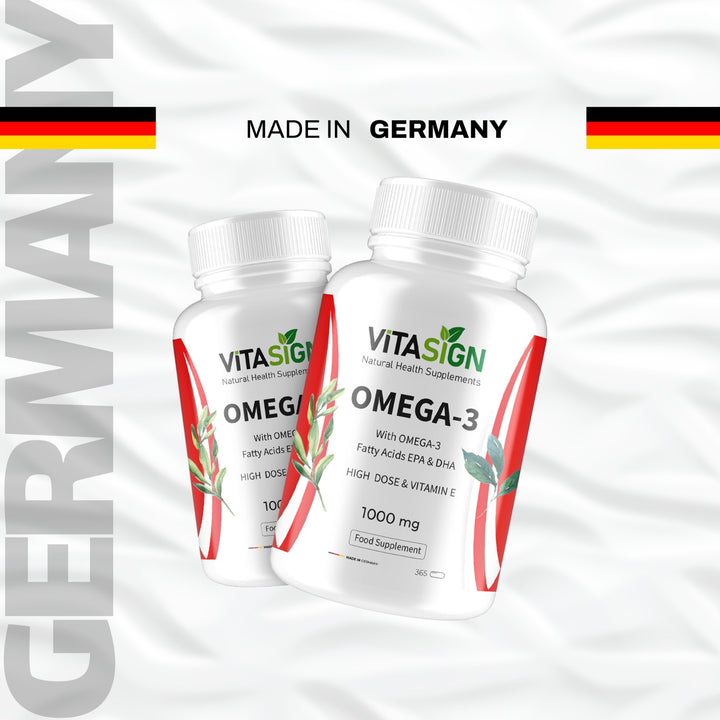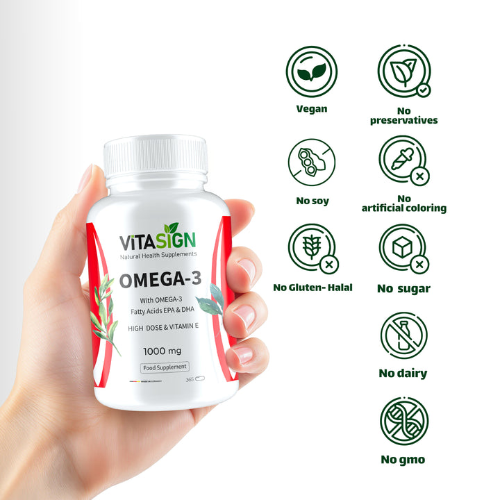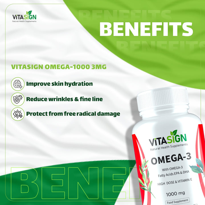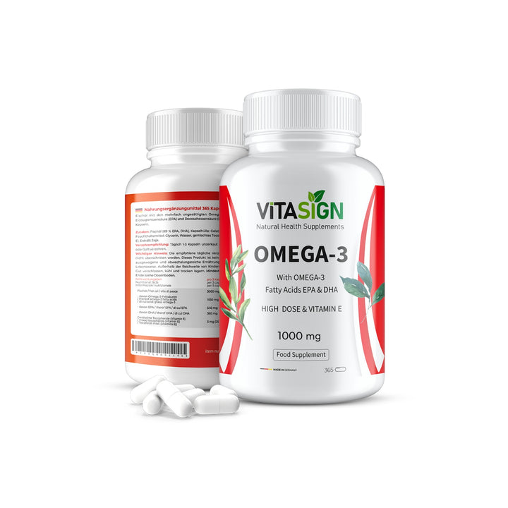 ViTASIGN Omega-3 softgels provide 1000mg of high-quality fish oil with EPA and DHA fatty acids.